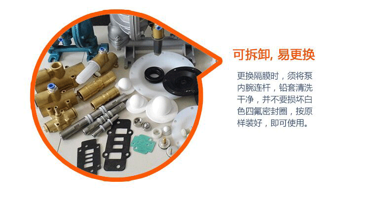 更換隔膜時,須將泵內腕連桿,鉛套清洗干凈,并不要損壞白色四氟密封圈,按原樣裝好,即可使用。